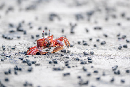 Crab walking on white sand beach walking into the sea, on the beach, at the sea, in the morning , the crab life lives on the sandy beach.