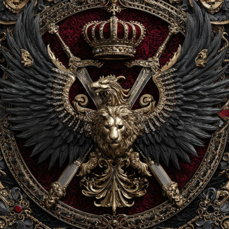 An ornate heraldic crest features a central lion's head, crowned and flanked by wings and crossed swords. The design utilizes a rich palette of gold, black, and red, employing detailed textures and a symmetrical composition. The image suggests a sense of royalty and power suitable for various commercial or decorative applications.