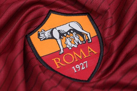 BANGKOK, THAILAND - AUGUST 13, 2016: the logo of the AS Roma football club on an official jersey on August 13,2016 in Bangkok Thailand.