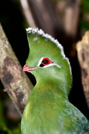 Livingstones Turaco (Tauraco livingstonii). Colourful bird with green plumage, a distinctive red circle around the eyes and white tipped feathers forming large crest on its head. Western Cape, South Africa.
