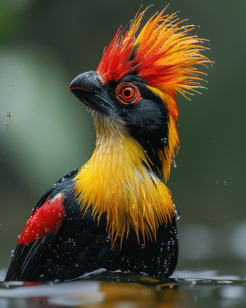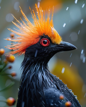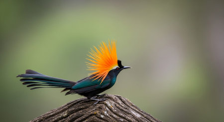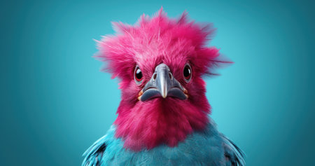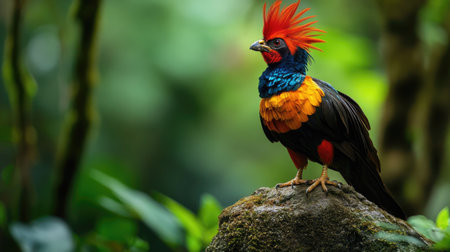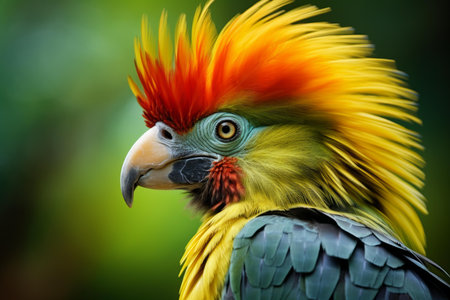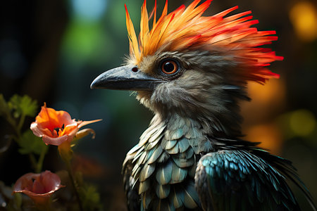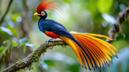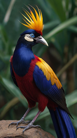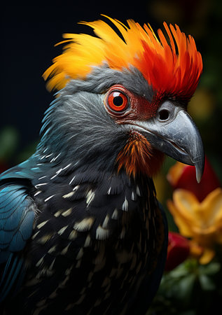 A striking portrait of an exotic bird boasting incredibly vibrant and elaborate plumage. Its iridescent crest and rich color palette create a stunning visual display. The bird embodies the unique beauty and diversity found in tropical wildlife.