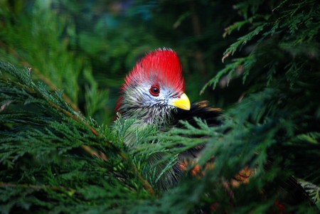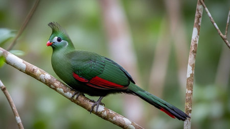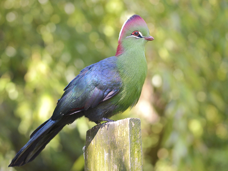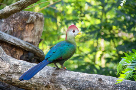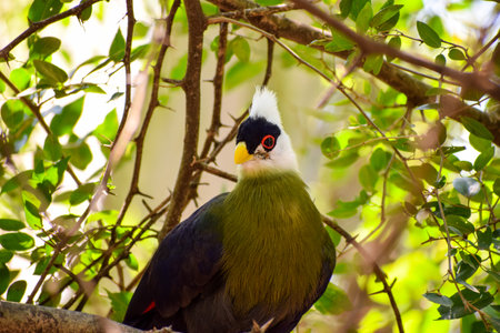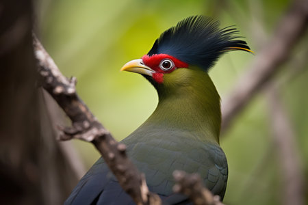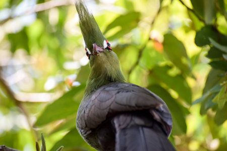 beautiful exotic tauraco bird in wildlife. exotic tauraco bird with green feather. exotic tauraco bird outdoor. photo of exotic tauraco bird in nature.