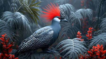 A striking bird with a bright crest stands among exotic plants in a misty setting.