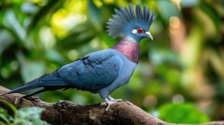 Victoria crowned pigeon with blue and purple plumage and a prominent crest is standing on a tree branch