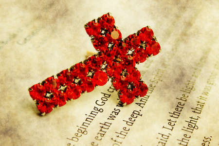 Religion christianity cross and red ribbon. Symbol of faith and worship in God. Religious christian service, holiday or concept