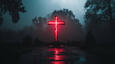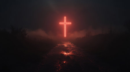 A striking neon cross radiates a vibrant glow in the darkness, casting reflections on a misty pathway. This captivating image evokes a sense of spirituality and mystery, inviting contemplation and reflection