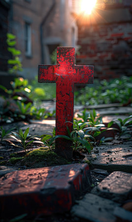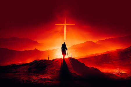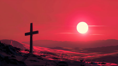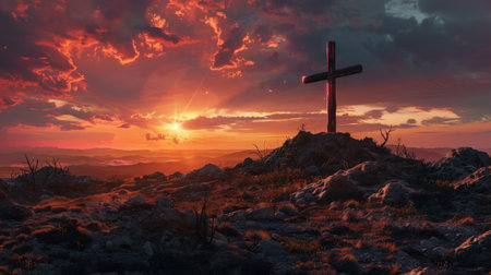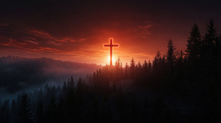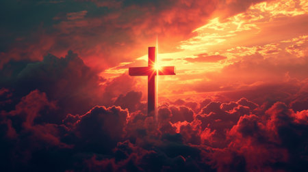 Cross illuminated by sunlight through dramatic red clouds, spiritual and religious symbolism concept