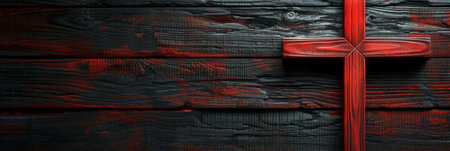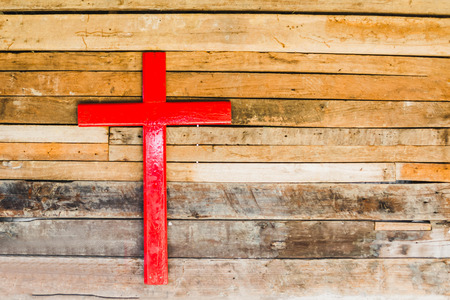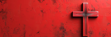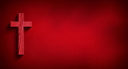 A simple, textured red background with a wooden Christian cross positioned on the left side. The cross has a slightly distressed, rustic appearance and casts a subtle shadow. The red background has a subtle texture and a gentle vignette effect, drawing attention to the religious symbol.