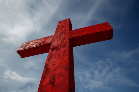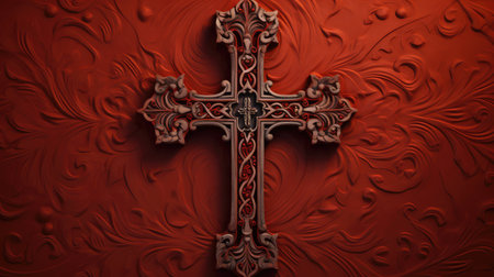 A cross rests on a table adorned with a vibrant red cloth, symbolizing Easter's significance.,