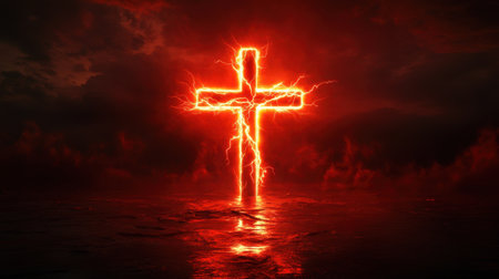 The cross radiates with red lightning, standing as a symbol of fiery faith and divine conviction against a dark background.