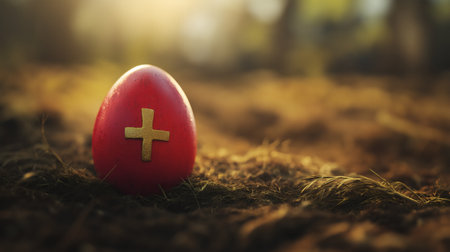 A symbolic image featuring a red Easter egg marked with a golden cross, placed on the ground with soft natural lighting. The scene evokes themes of resurrection, renewal, and faith.