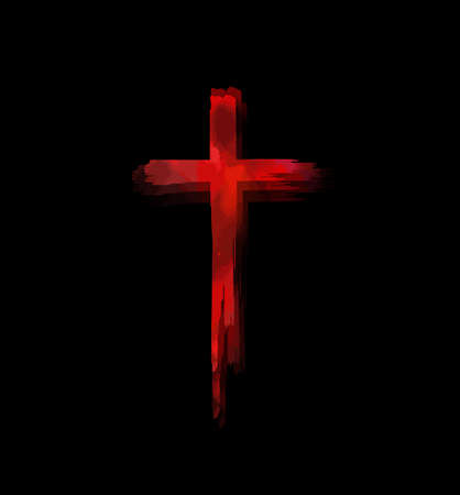 Abstract cross with red spots, stains and splashes of paint or blood in grunge style. Creative vector banner or illustration on a religious theme. Artistic Christian cross isolated on light background