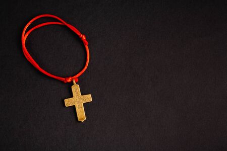 Christian cross on a red rope, on a black background with an empty place. Stock photo cross top.