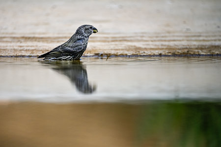 Crossbill or Loxia curvirostra, reflected in a golden spring