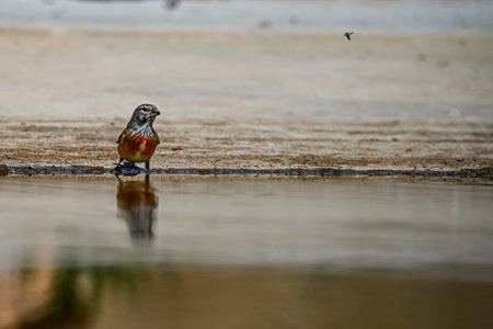 Closeup of a beautiful male wet hawfinch; Coccothraustes coccothraustes drinking, washing, preening and cleaning in water. Selective focus and low poit of view, natural sunlight