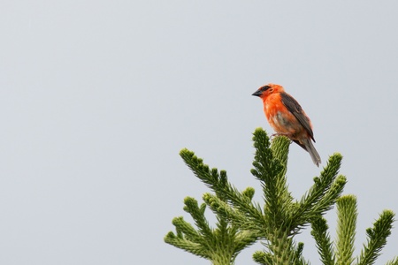 Endemic Red Fody bird of the Seychelles, sitting on top of a conifere