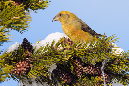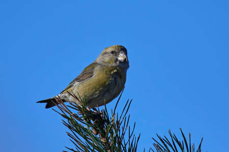 Male Red (or Common) Crossbill (Loxia curvirostra) in a pine tree with a blue sky