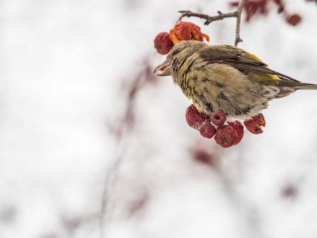 Pine Grosbeak Female Eating Red Berries in Winter. Female Pine grosbeak, Pinicola enucleator, sitting on the tree branch and eats wild apple berries in winter season