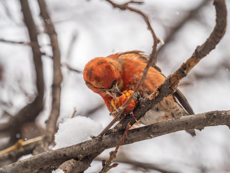 Pine Grosbeak Celebrating New Year by Eating Seeds on the Snow