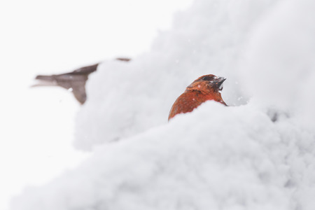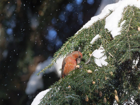 Conceptual blurred shot of Parrot Crossbill (Loxia curvirostra) in the snow.