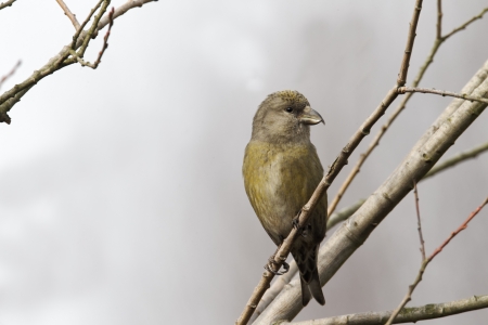 Crossbill, Loxia curvirostra, Single female on branch, Staffordshire, March 2012