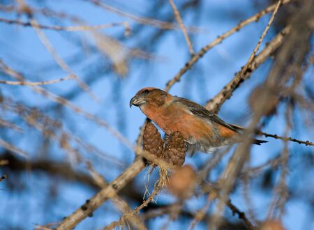 Crossbill (Loxia curvirosta) sitting on a tree in winter