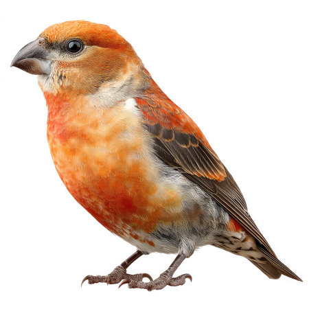 This close-up image features a vibrant crossbill bird isolated against a white background, showcasing its beautiful orange plumage and unique features. Perfect for wildlife enthusiasts and nature lovers.