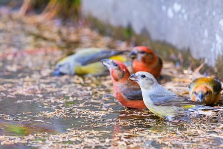 A flock of red crossbill drinking water