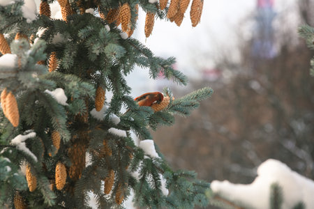 White-winged Crossbill male feeding on Spruce cones. Crossbill on spruce in winter