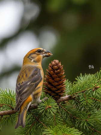 Pine grosbeak (Pinicola enucleator) is typical bird of North taiga, as well as typical invasive species (nomadic migration, breeds and winters where many seeds of conifers and ash berries). Female