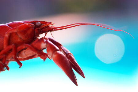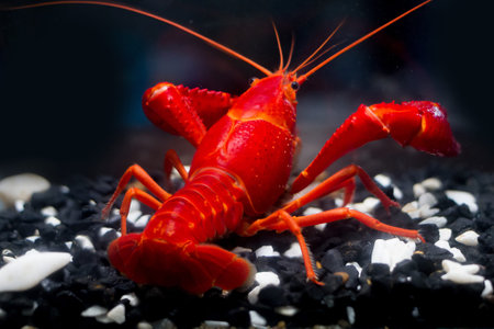 Mexican orange freshwater crayfish in the aquarium, selective focus and space for text