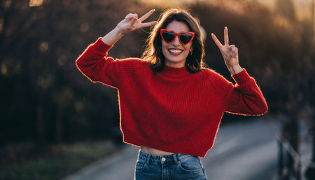 Happy young woman making double peace sign gesture with bright smile, wearing red knit sweater and heart sunglasses. Perfect for lifestyle campaigns, social media, and positivity content.