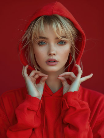 A woman in a red hoodie exudes confidence and bravery in dim light. Concept Portrait Photography, Red Hoodie, Confidence, Bravery, Dim Light