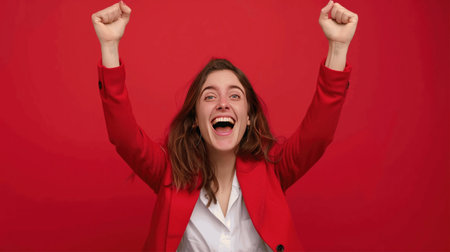 A joyful young woman celebrates her success with raised arms and a big smile against a vibrant red background, capturing the essence of excitement and positivity.
