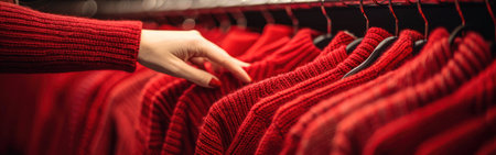 Closeup of a womans hand reaching out to grab a red sweater hanging on a rack.