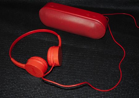 Red headphones and music speaker on a black