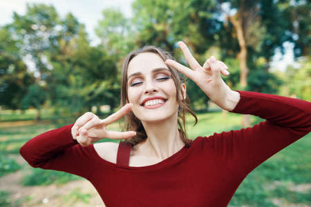 Portrait of a smiling happy woman showing victory sign posing outdoors on green summer nature background. Female beauty concept