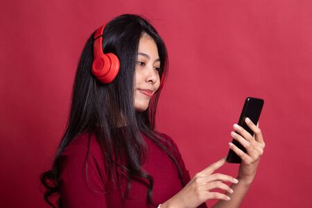 Pretty asian girl listening music with her headphones on red background.