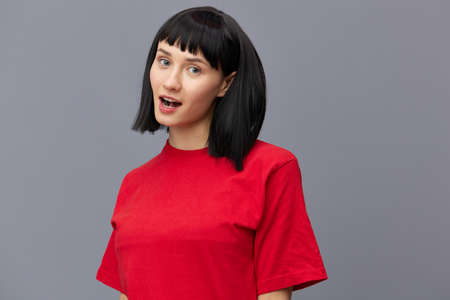 horizontal photo of a beautiful woman with short black hair looking pleasantly into the camera standing on a gray background in a red T-shirt