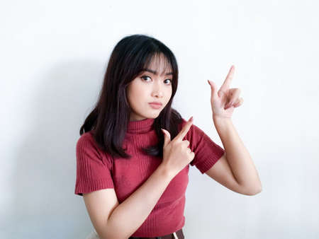 Happy and smile face with smile of young Asian girl in red shirt with hand point on empty space.
