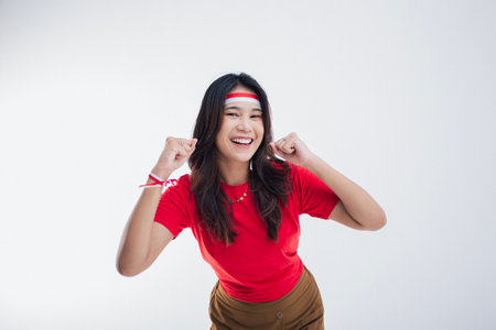 Cheerful young Asian woman in a red shirt and white pants is smiling and raising her hand in the air. Indonesia Independence Day concept.