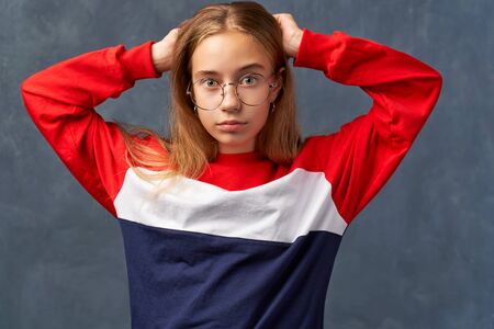 Serious grumpy female holds head with two hands
