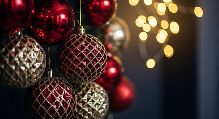 A detailed view of ornate Christmas baubles in rich red and metallic gold hues, suspended against a backdrop of soft, glowing fairy lights, evoking a sense of warmth and celebration.