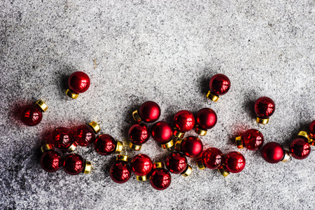 Christmas card concept with variety of holiday festive red balls on concrete background