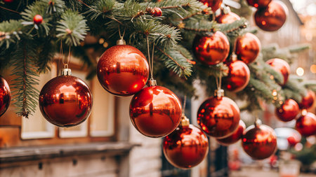 Close-up of red Christmas ornaments hanging on a pine tree branch in a festive holiday setting with background lights.