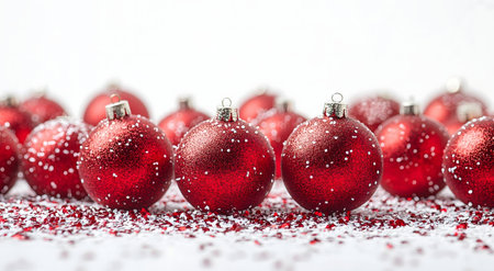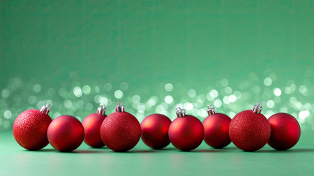 A visually captivating scene featuring bright red Christmas ornaments arranged on a green background, enhanced with a sparkling bokeh effect for a festive touch.