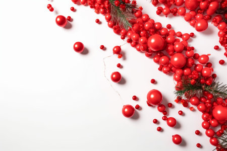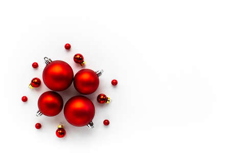 Decorative red balls on a white background. Top view, flat lay. Banner