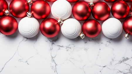 Christmas background with red and white baubles on white marble background