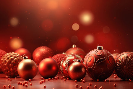 Group of decorative red christmas ornaments background, forming festive seasonal background. Perfect for greeting cards or holiday promotions.