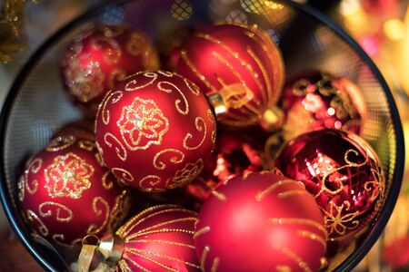 Close up of red and golden Xmas balls decoration pile. Overview of shiny baubles. Festive backdrop.